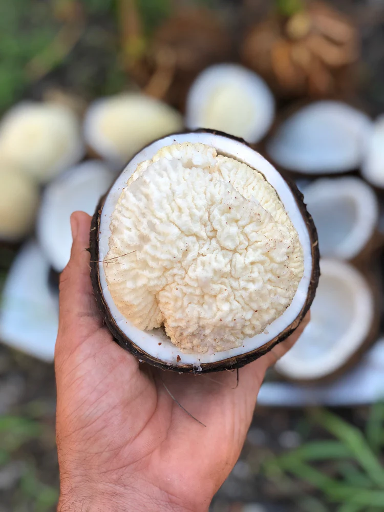 Naturally sprouted coconut with a sweet, sponge-like kernel. A healthy snack,